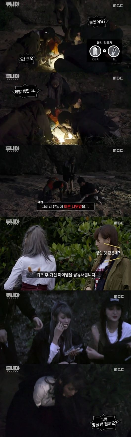 이날 돈스파이크부터 딘딘까지 5인이 두니아에 떨어졌다. 이들은 아직 서로의 마음이나 능력치를 몰라 경계하면서도 각자가 가진 물품을 공유하며 생존을 위해 합동하는 모습을 보였다. 앞서 두니아에 만난 유노윤호, 정혜성, 권현빈, 루다, 샘 오취리도 한 팀이 돼 함께 생존을 도모했다. 유노윤호의 진두지휘 아래, 다섯 사람은 저마다 역할을 분담해 식량부터 잠자리까지 구해 팀워크를 발휘했다. 갈등했던 것도 잠시, 5인은 척척 맞는 손발에 감탄하며 무사히 한 고비를 넘긴 것을 자축했다.
