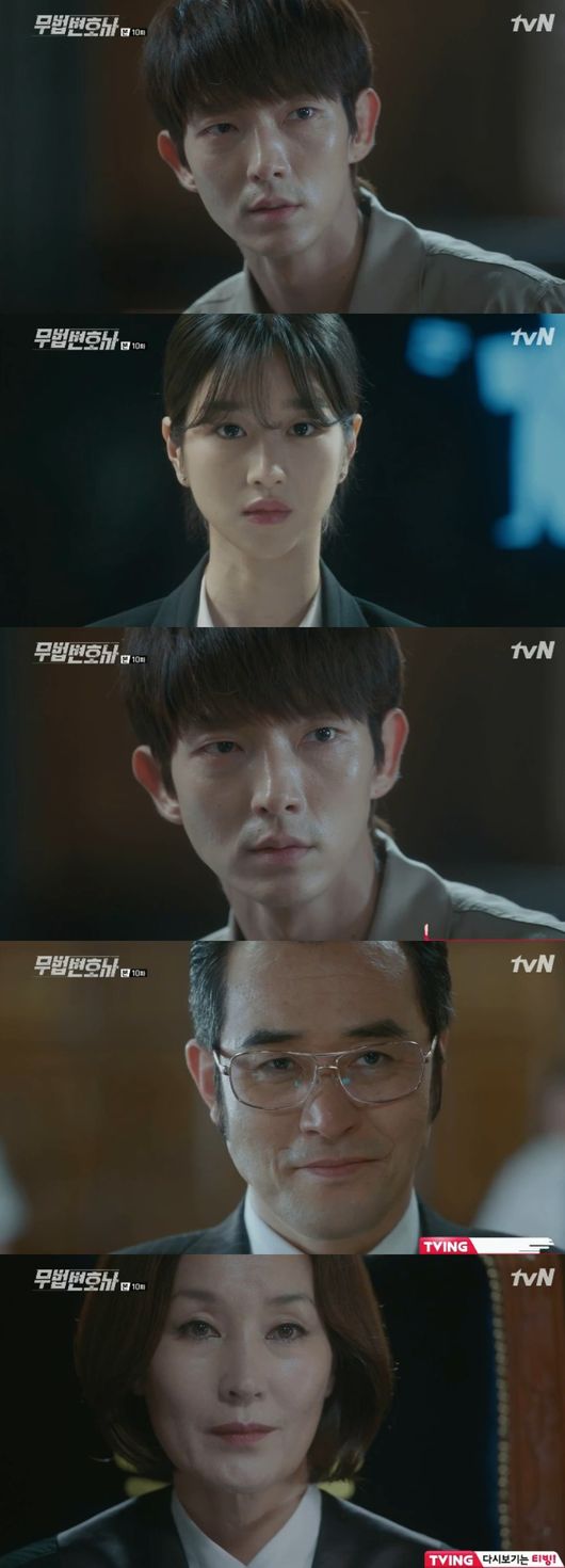 10일 방송된 tvN 주말 드라마 '무법 변호사(연출 김진민,극본 윤현호)'에서 안오주(최민수 분)이 상필(이준기 분)의 증인에 섰다. 반전의 대 반전이었다.