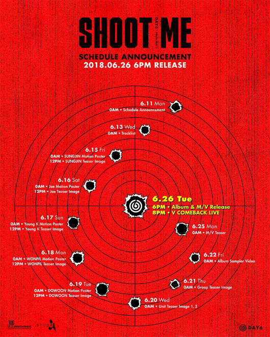특히 공개된 스케줄 어나운스먼트 이미지는 'Shoot Me'라는 강렬하고 도발적인 문구와 이에 걸맞게 표적판, 또 총알이 표적판을 여러 번 관통한 모습을 담아 시선을 모은다. 이를 통해 그간 서정적, 감성적 노래들로 사랑받아온 데이식스가 컴백하면서 선보일 콘셉트와 신곡에 대한 호기심도 증폭되고 있다.