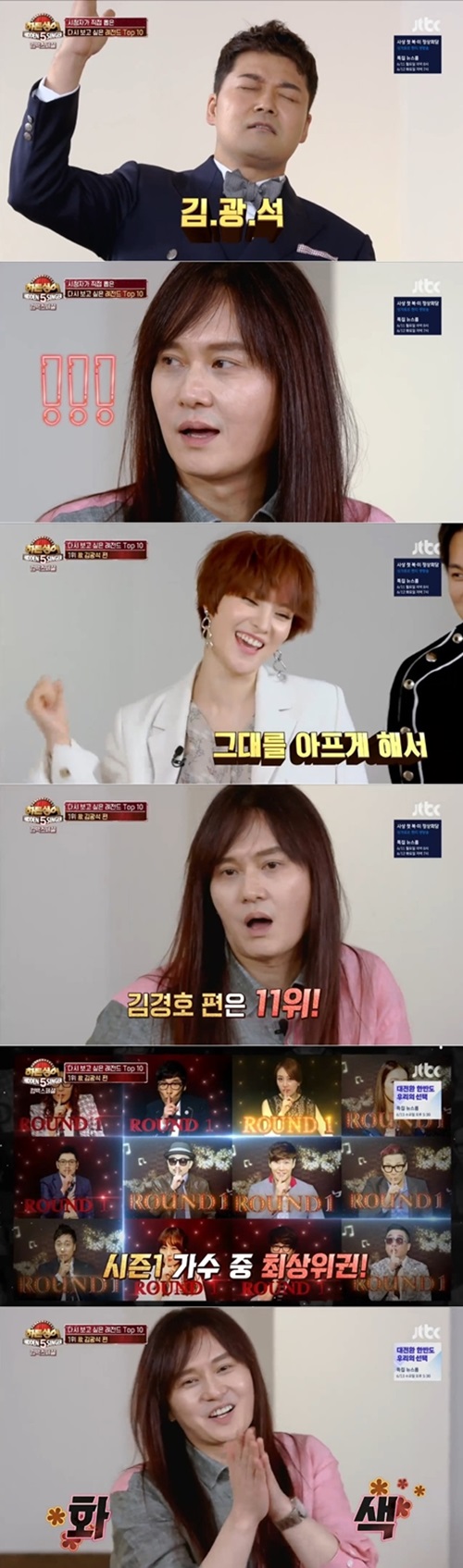 김경호는 TOP 10에 뽑히지 못한 설움을 뿜어낸 가운데 전현무가 시즌1 가수 중에 유일한 상위권이라며 김경호가 TOP 11위를 기록한 사실을 전했다. 이에 김경호는 언제 서러웠냐는 듯 금새 활짝 웃음 꽃을 피우는 등 솔직한 매력으로 스튜디오를 다시 한 번 웃음으로 물들였다.