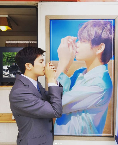 사진에서 박형식은 뷔의 멋진 포즈를 마주보며 그대로 따라하고 있다. 이는 뷔가 박형식을 위해 KBS 2TV '슈츠' 촬영장에 커피차를 보낸 것.