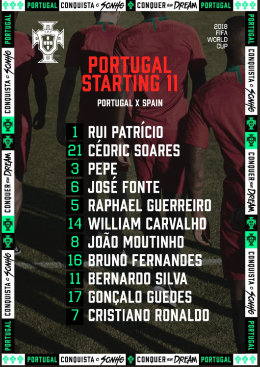 결전을 앞둔 포르투갈과 스페인은 선발 라인업을 공개했다. 포르투갈은 다시 4-4-2로 나섰다. '에이스' 크리스티아누 호날두와 곤살로 게데스를 최전방에 배치했다. 측면에서는 브루노 페르난데스와 베르나르두 실바가 지원에 나섰다. 중원에는 월리엄 카르발류-조앙 무티뉴가 배치됐다. 라파엘 게레이로-페페-조세 폰테-세드릭이 포백을 형성했다. 선발 골키퍼는 루이 파트리시우.