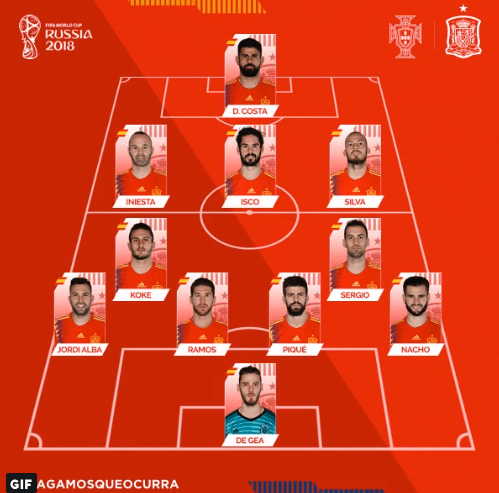 스페인은 4-2-3-1 포메이션을 택했다. 최전방에는 디에고 코스타, 2선에는 다비드 실바, 이스코 안드레아 이니에스타가 배치됐다. 중원은 세르히오 부스케츠-코케가 나섰다. 조르디 알바 - 헤라르드 피케 - 세르히오 라모스 - 나초가 포백을 형성했다. 선발 골키퍼는 다비드 데 헤아.