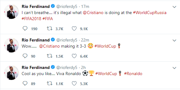 맨체스터 유나이티드(이하 맨유)의 전설이나 호날두와 함께 뛰기도 했던 리오 퍼디난드도 그의 활약에 찬사를 보냈다. 퍼디난드는 자신의 SNS를 통해 "와우... 숨도 못 쉬겠다. 호날두가 스페인전 마지막 동점골은 믿기지 않을 정도다"고 극찬했다.