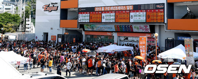한화는 16일 대전 한화생명이글스파크에서 열리는 2018 신한은행 MY CAR KBO리그 두산과 홈경기에 1만3000석 모두 들어찼다. 오후 5시 경기 시작에 앞서 3시36분에 매진이 이뤄졌다. 경기 전부터 이글스파크 인근은 야구를 보러 오기 위한 관중들의 발걸음으로 인산인해를 이뤘다.