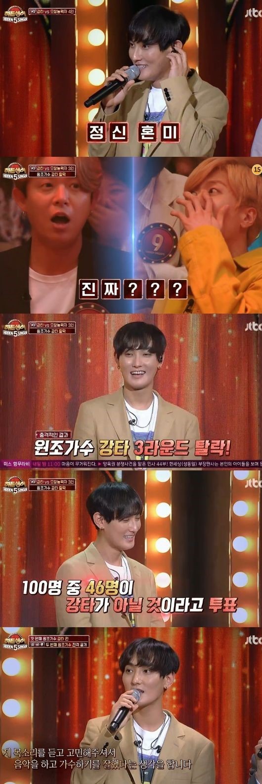 이날 첫 방송된 '히든싱어5'는 첫 회부터 원조 가수 강타가 3라운드에서 탈락하는 충격적인 결과로 시청자들을 놀라게 했다. 강타는 자신이 작사, 작곡한 불멸의 히트곡 '빛'을 불렀지만, 46표를 받아 3라운드에서 탈락하고 말았다. 예상치 못했던 강타의 탈락에 시청자들의 뜨거운 관심이 쏠렸고, 이러한 결과가 시청률 수치로 확인됐다.