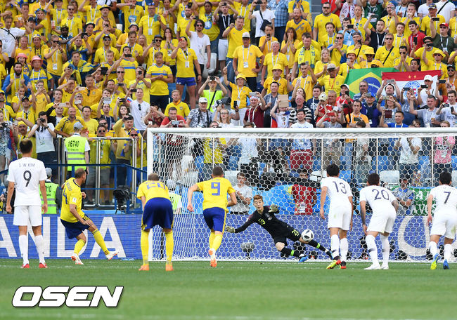 한국은 후반 19분 페널티킥을 내줬다. 김민우가 박스 안에서 태클로 클라이손의 발을 걸어 넘어트렸다. 한국은 결국 그란크비스트에게 선제골을 허용했다.