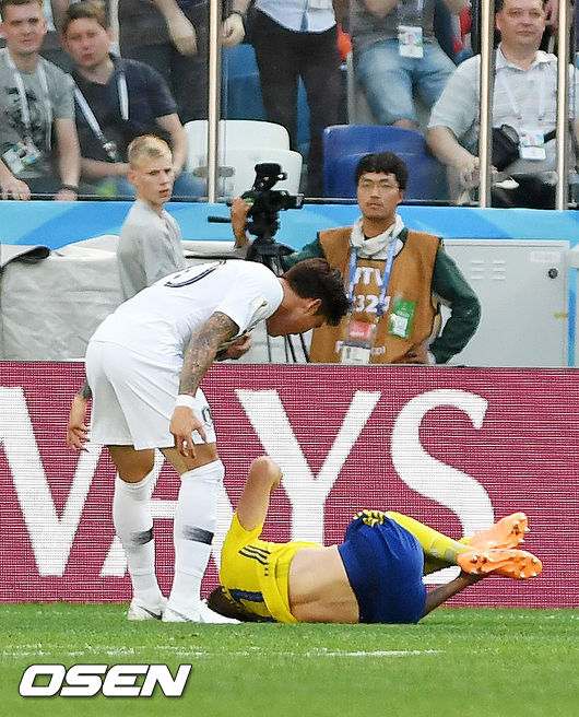 주심의 노 파울은 한국이 볼을 갖고 스웨덴 진영 중앙까지 진출한 뒤 VAR로 바뀌었다. 이번 대회서 처음 도입된 VAR 판독 결과 주심의 판정은 수정됐고 스웨덴이 페널티킥을 얻어냈다. 상대 키커 그란크비스트가 침착하게 성공시켜며 이날의 결승골이 됐다.