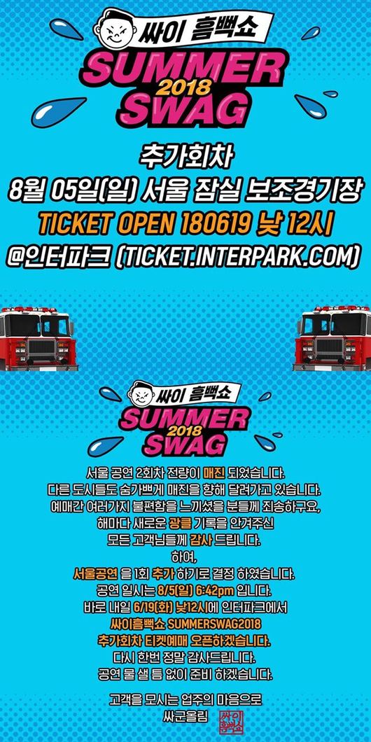 싸이의 여름 공연 브랜드 ‘싸이 흠뻑쇼 SUMMER SWAG 2018’이 더욱 뜨거워진 티켓 대란 속 오늘(19일) 정오에 인터파크 티켓 단독으로 추가 티켓이 오픈된다.