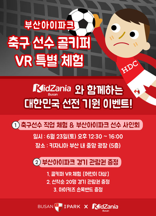 부산아이파크는 오는 23일 부산시 해운대구에 위치한 키자니아 부산 내 중앙 광장 (5층)에서 축구 선수 골키퍼 VR특별 체험 이벤트를 진행한다. 직접 골키퍼가 되어 축구공을 실감나게 막아내는 체험을 할 수 있는 VR존을 오후 4시까지 운영하고, 부산아이파크 선수단의 특별 팬 사인회도 1시간 동안 진행 될 예정이다.