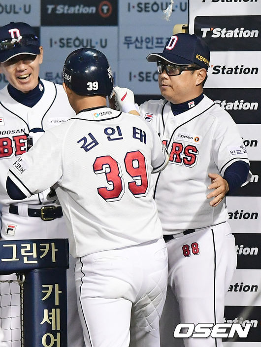 두산 베어스의 김태형 감독이 전날 맹타를 휘두른 김인태의 활약에 미소를 지었다.
