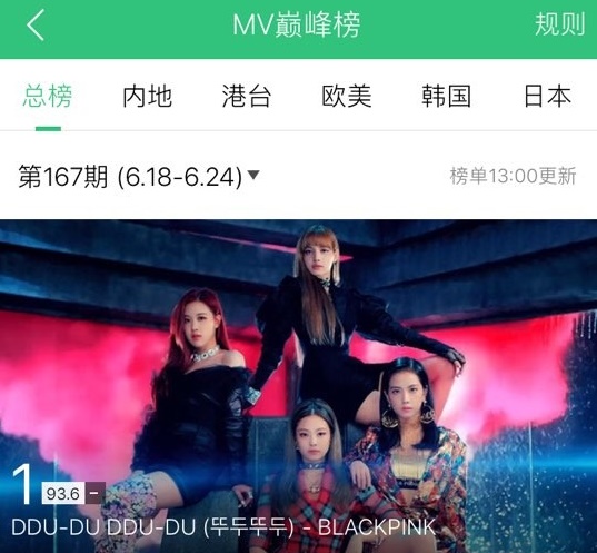 지난 15일 신곡 ‘뚜두뚜두’가 발표된 이후, 다음 날부터 종합MV차트와 KPOP MV차트에서 6일째 1위를 굳건하게 유지하며 중국에서 나날이 블랙핑크의 인기가 치솟고 있다.
