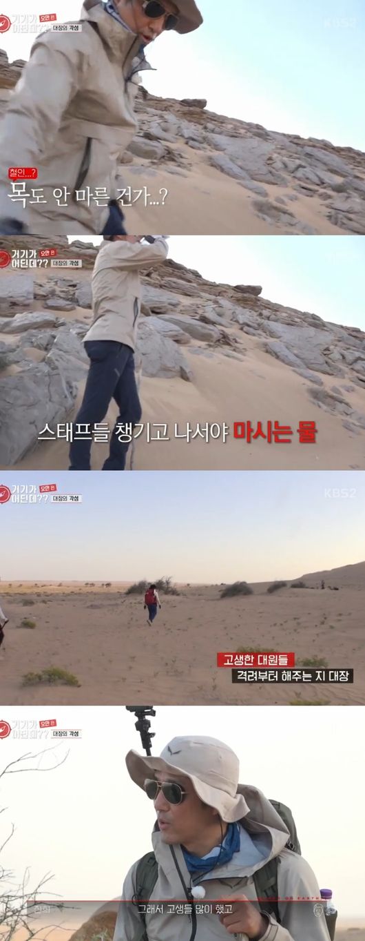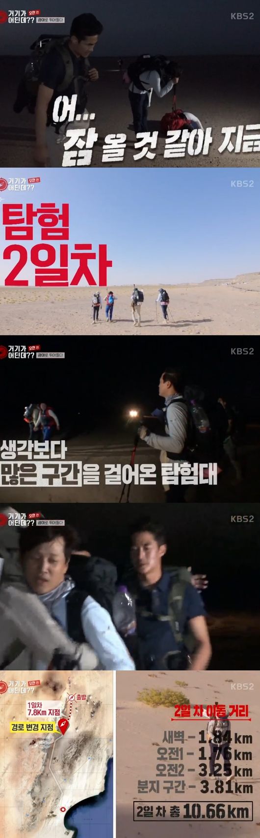 22일 방송된 KBS '거기가 어딘데'에서는 2일차 사막 탐험에 접어든 대원들의 모습이 담겼다. 첫날보다 일찍 나선 대원들은 해가 강하지 않자 체력을 자랑하며 걸었다.