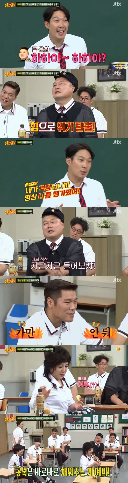 강호동은 하하에게 아내 별과 싸운적 없냐고 질문, 하하는 "난 한번도 싸운 적 없다, 혼나는 스타일"이라면서 "내 유일한 술 주정이 불 켜고 다 깨우고 파티하는 것, 이제 많이 고쳤다"고 수습해 웃음을 안겼다.