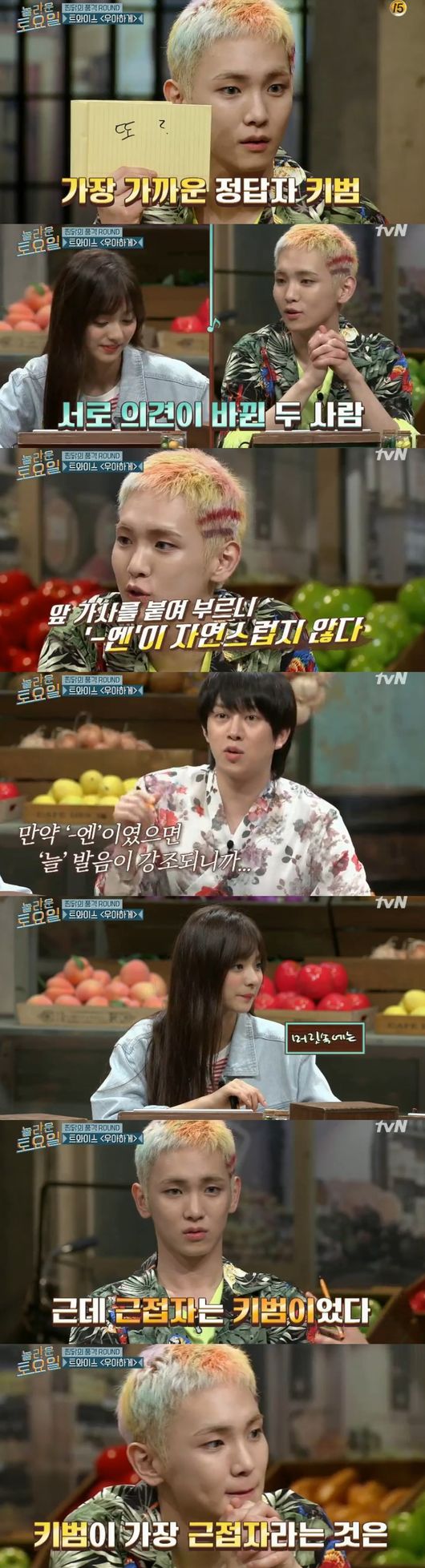 계속해서 두번째 음식 '찜닭'이 걸린 문제가 소개됐다. 이번 문제에 대해 '난 쯔위라고해'라며 키에게 혼란을 줬던 '트와이스' 노래라고 말했고, 이어 '우아하게' 노래가 흘러나왔다. 신동엽은 "딸이 트와이스와 레드벨벳 팬이다"면서 "매일 듣던 노래, 정확하게 들었다"며 자신만만해했다.