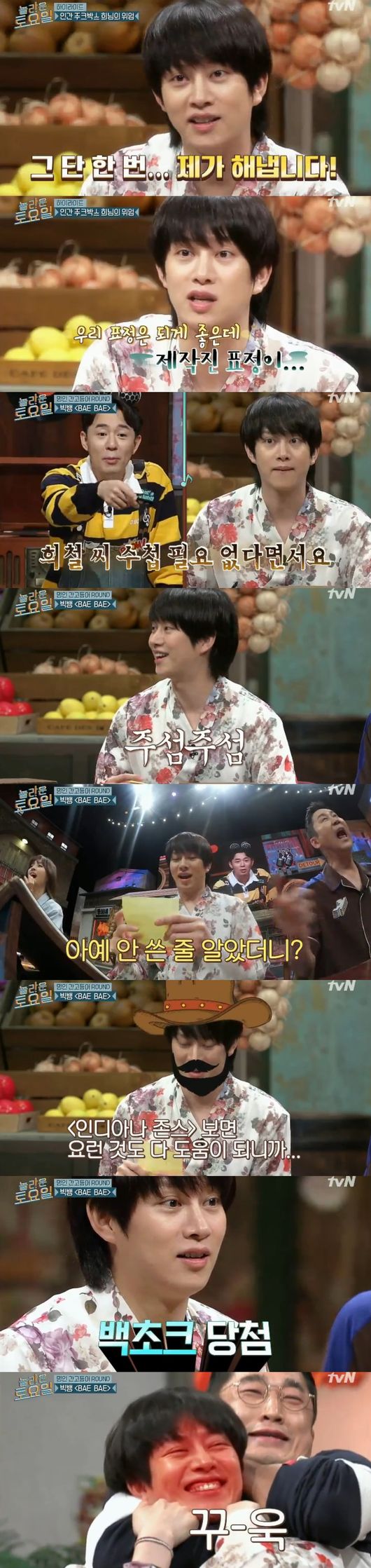 드디어 첫번째 문제가 출제됐다. 고등어 구이가 걸린 문제였다. 쥬크박스로 유명한 김희철은 "방송 분량 모자라도 괜찮냐"며 자신만만한 모습을 보였다. 1차 시도에 성공한 적도 없기에 붐은 단 번에 성공을 부탁, 김희철은 "그 어려운 거, 오늘 제가 해냅니다"고 말했고, 혜리는 "처음으로 든든한 게스트가 나왔다"며 기뻐했다.
