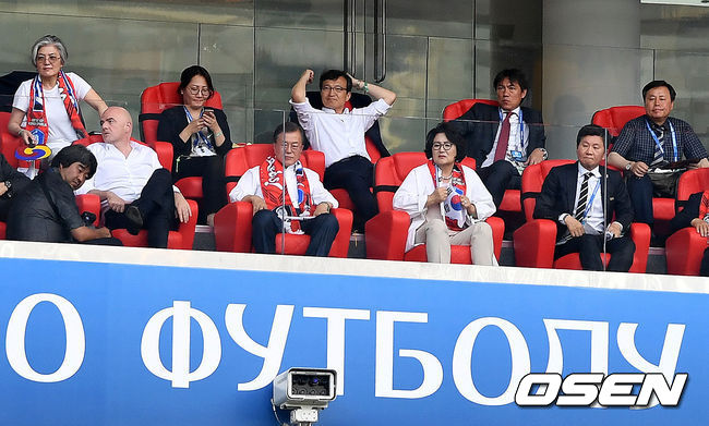 이날 경기에 참석한 문 대통령은 역대 대통령 가운데 처음으로 해외에서 열리는 대표팀 경기를 관전한 것이다. 대통령이 대표팀의 월드컵 경기를 관전하는 건 2002년 한일월드컵 당시 김대중 전 대통령 이후 16년 만이다. /letmeout@osen.co.kr