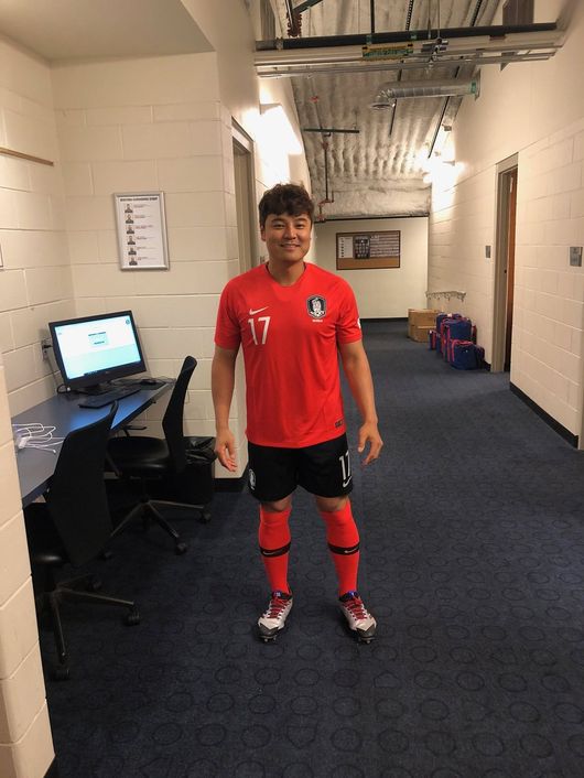 추신수(36·텍사스)가 월드컵 축구대표팀 유니폼을 입었다.