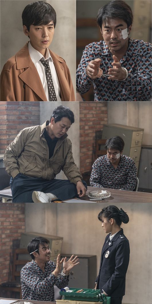 반면, 한충호는 수갑을 차고 경찰서까지 끌려온 상황에서도 능글능글 능청스러운 미소로 웃음을 자아낸다. 거칠고 마초적인 강동철(박성웅 분)의 심문에도 기죽지 않는 한충호는 윤나영(고아성 분)에게 농담까지 건네는 여유로 한량다운 천연덕스러움을 발산한다.