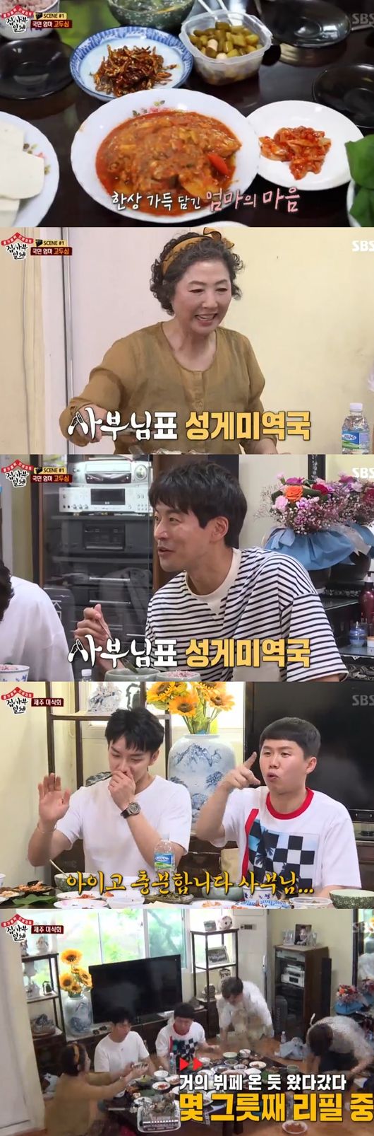 이어 고두심은 밥상을 차리기 시작했고, 제자들이 도와주겠다고 해도 한사코 혼자서 준비했다. 고두심은 성게미역국 외에도 두부 장인이 만든 두부, 각종 젓갈, 뿔소라 등 제주도 특산물로 한상을 거하게 차려냈다.