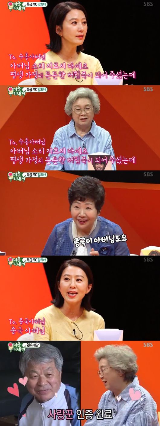 특히 김희애는 나긋나긋한 목소리로 박수홍의 부친에게 영상편지를 띄웠다. 평소 아내에게 큰소리를 자주 낸다는 말에 "수홍 아버님! 이제부터라도 어머니에게 소리 지르지 마세요! 제가 체크하겠습니다"라고 단호하게 메시지를 전했다.