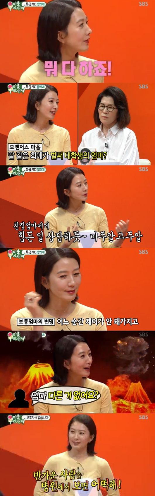 신동엽은 "아들을 키우면서 때린 적도 있나"라고 질문했고 김희애는 제가 잔소리가 많은 편이 아니다. 흥분할 때까지 참지 않아야 하는데 웃으면서 참다가 어느 순간 제어가 안 되더라"고 답했다.