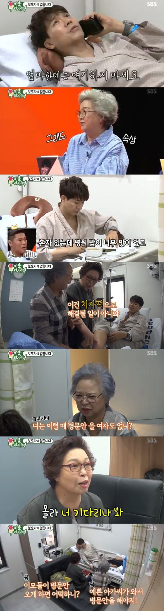 결국 박수홍은 혼자 치료를 받고 입원 수속까지 밟았다. 홀로 병실에 누워 링거를 맞았고 얼음 찜질도 받았다. 좁은 병실에서 혼자 누워 있는 아들을 보며 엄마의 마음은 타들어갔다. 이를 아는지 모르는지 박수홍은 병원 밥까지 맛있게 먹어 웃음을 안겼다.