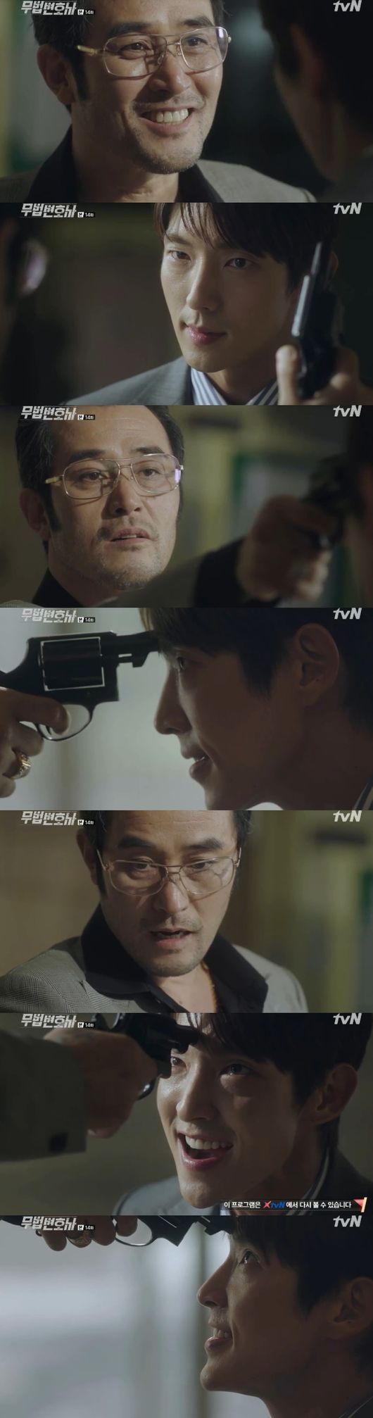 24일 방송된 tvN 주말드라마 '무법변호사(연출 김진민,극본 윤현호)'에서는 상필(이준기 분)에게 총을 겨눈 안오주(최민수 분)의 도발이 그려졌다.