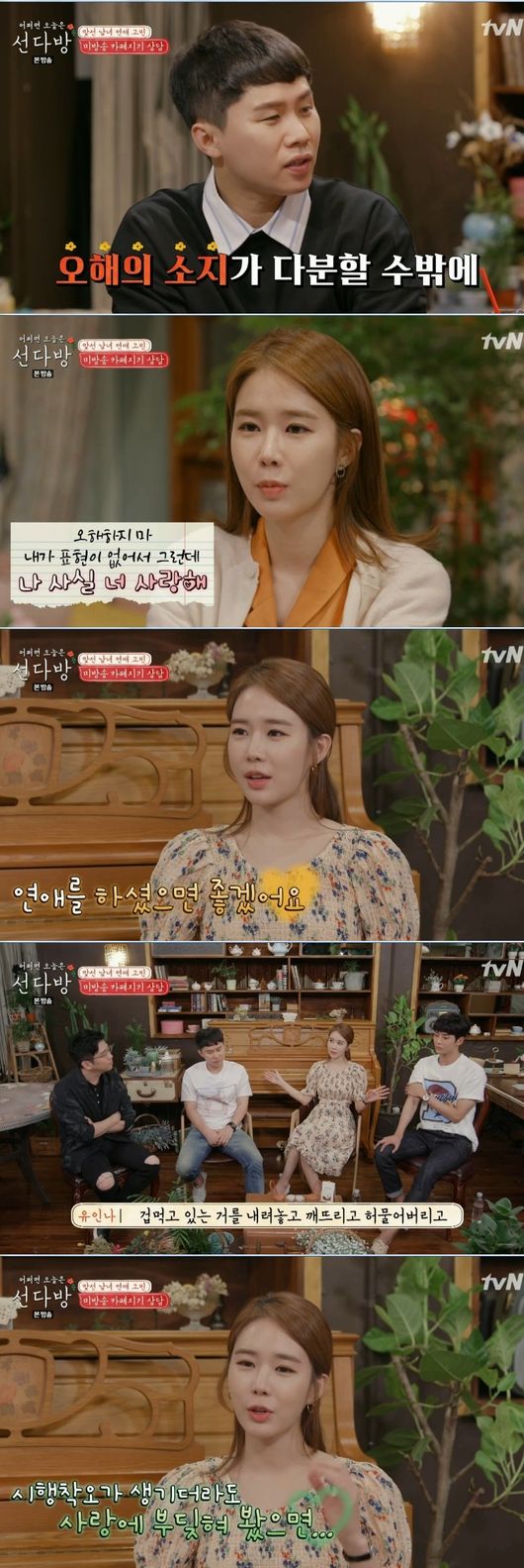 이날 카페지기들은 고민지에 적었던 맞선남녀들의 고민도 각자의 견해대로 답을 내놨다. 애교가 없어서 걱정이라는 맞선녀에게 이적은 "표현은 중요하다. 표현 안해도 상대방이 알 거라는 생각은 안하는 게 좋다. 표현해야 안다. 말로 하는 게 힘들면 문자나 편지를 써서 좋아하는 마음을 알려야 한다"고 말했다.