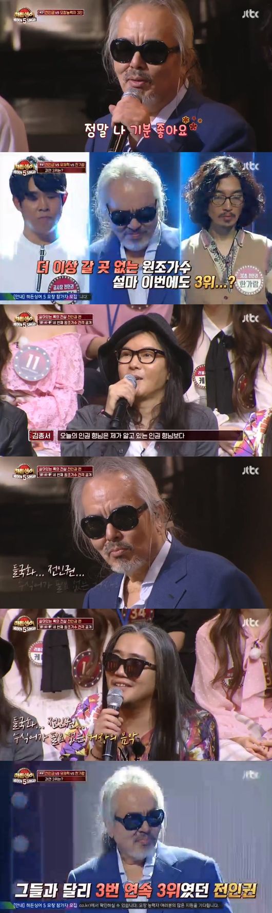 김종서는 “제가 알던 인권이 형님보다 대단했다”며 이날의 전인권에 엄지를 치켜들었으며, 박완규는 “보통 유행가는 그 시절이 지나면 사라지지만 그 단계가 예술의 단계로 올라가면 영원히 기억된다. 그게 들국화다”라며 칭찬을 아끼지 않았다. 이처럼 여전히 많은 후배들의 존경을 한 몸에 받고 있는 전인권은 원조가수로서의 위엄을 드높이며 최종우승을 거머쥐었다. / besodam@osen.co.kr