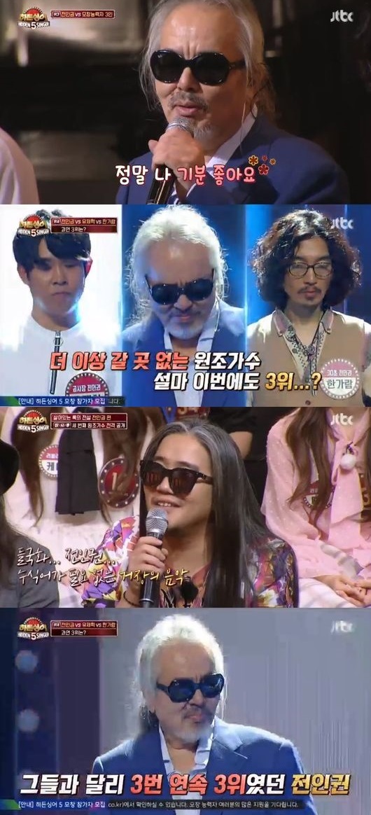 지난 24일 오후 방송된 JTBC ‘히든싱어5’에서는 가수 전인권이 출연해 시청자들의 귀를 즐겁게 했다. 전인권은 “자신이 없었다. 내가 도대체 어떤 가수인지 아직까지 파악을 못 하고 있다”며 섭외에 대해 고민한 이유를 설명하며 “제작진의 부탁으로 이 자리에 섰다”고 밝혔다. 그런 전인권은 “여기 오니까 그냥 막 떨린다”고 말하며 긴장했음을 드러냈다.