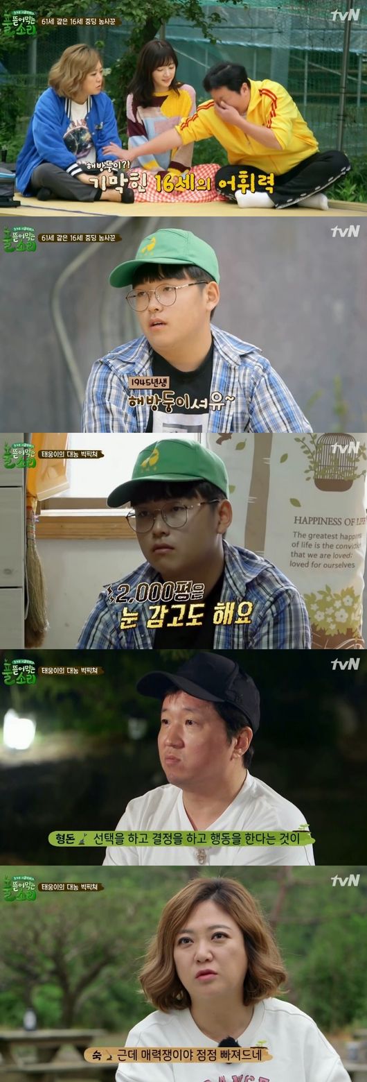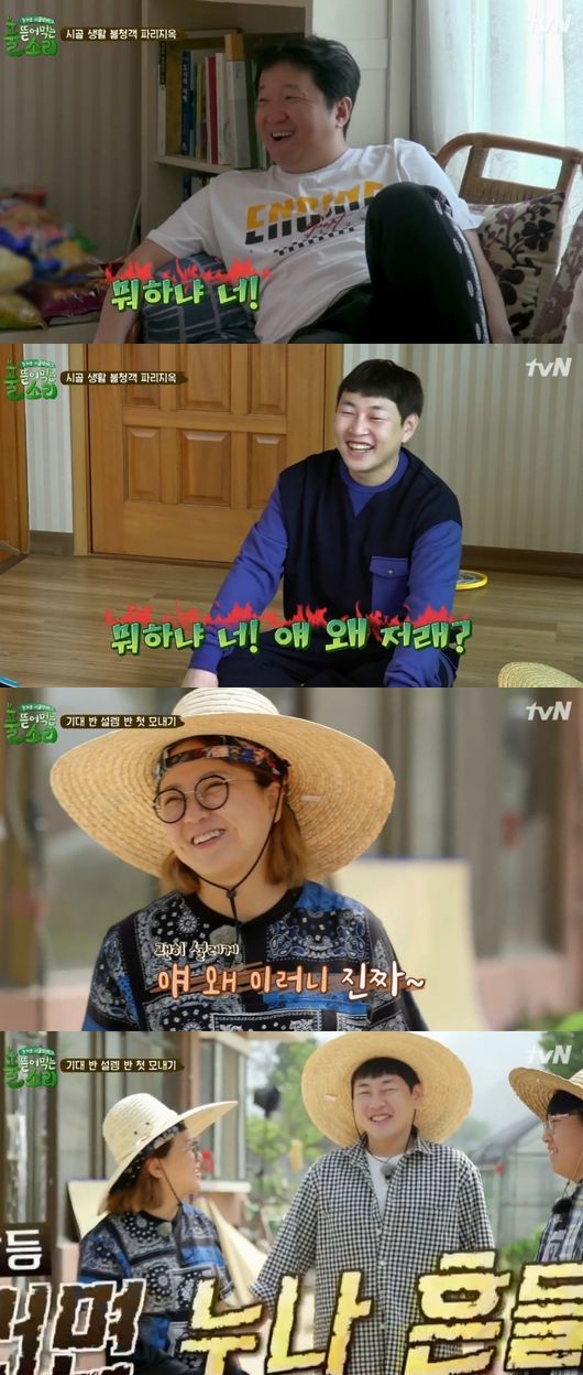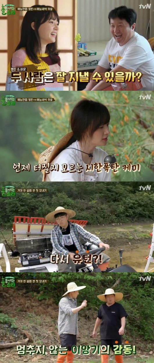 25일 첫방송된 tvN '풀 뜯어먹는 소리'에서는 농사 체험에 나선 김숙, 정형돈, 송하윤, 이진호의 모습이 담겼다. 터미널에서 만난 4사람은 만나자 마자 분식집에서 잔치 국수를 먹으며 친분을 쌓았다.