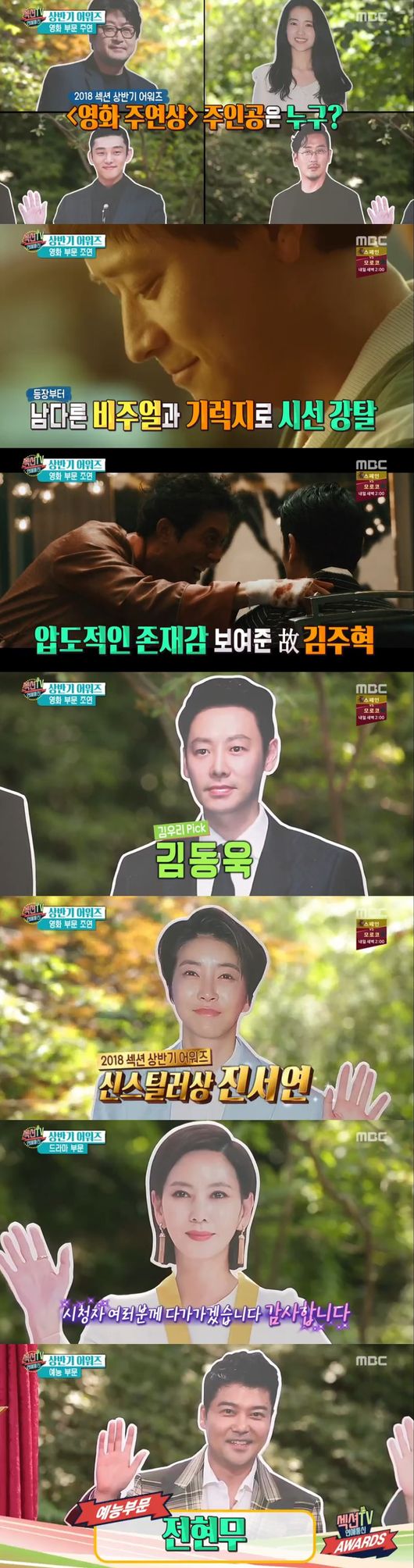 계속해서 섹션편집자들이 직접 뽑은 최고의 스타, '2018 상반기 어워즈'를 시작했다. '영화주연상' 부문에서는 영화 '1987'에서 악역의 진수를 보여준 배우 김윤석이 차지, 섹션에서 특별히 준비한 메달을 전했다. 다음은 주연 못지 않은 존재감을 밝힌 '신스틸러상' 부문에서는 배우 진서연을 꼽았다. 계속해서 '드라마부문'에서는 6년만에 드라마로 컴백해 최고의 앵커라는 새 캐릭터를 소화한 시청률 여왕 김남주에게 주어졌다. 이 분위기를 몰아 '예능부문'에서는 송은이에게 돌아갔으며, 경쟁 후보로 올랐던 이상민이 직접 메달을 걸어줬다. 가수부문에서는 역시나 모두의 예상대로 K팝 역사를 새로 쓴 방탄소년단이 차지했다.