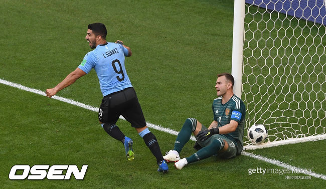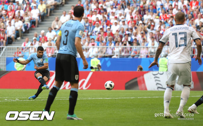 우루과이는 전반 9분 역습 찬스서 벤탕쿠르가 아크서클 근처에서 프리킥을 얻어냈다. 수아레스가 키커로 나서 오른발 땅볼 슈팅으로 러시아 골망을 흔들었다.