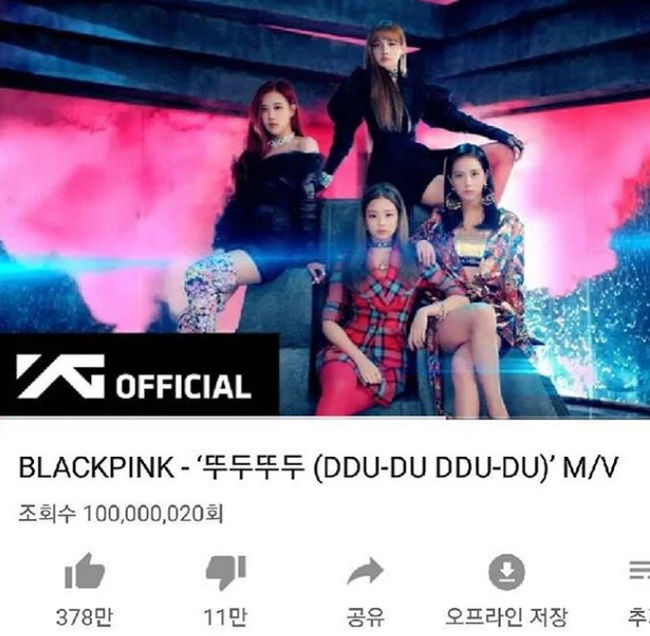 그룹 블랙핑크의 '뚜두뚜두' 뮤직비디오가 1억뷰를 돌파했다. 10일만에 국내 걸그룹 최단 기록을 세운 것.