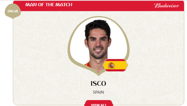 스페인은 경기 초반 패스 미스로 인해 모로코에 선제골을 내줬다. 0-1 상황에서 이스코가 이니에스타의 패스를 받아 동점골을 터트리며 경기를 원점으로 돌렸다. 활약을 이어간 이스코는 경기 후 MOM으로 선정됐다.