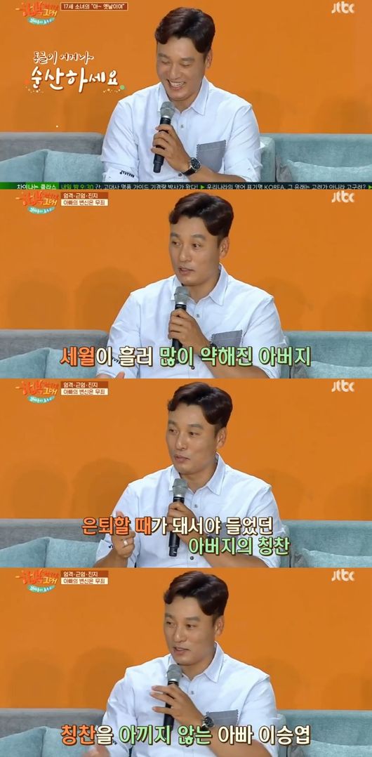 이승엽은 "예전 홈런을 쳐도 사실 아버지가 칭찬을 하지 않으셨다"며 운을 뗐다. 하지만 이제는 세월이 흘러 많이 약해지셨다는 것. 은퇘할 때가 돼서야 들은 처음 칭찬에 대해 입을 열었다. 이승엽은 "아버지가 장하다, 사랑한다고 하셨을 때 감동받았다"면서 아버지와의 추억을 떠올렸다.