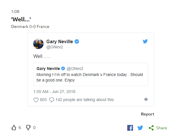 게리 네빌은 프랑스-덴마크와 경기가 열리기 전 '이 경기를 보기 위해서 쉰다. 멋진 경기를 예상한다' SNS를 올렸으나 경기를 보고 나서는 '아...'라는 외마디 비명으로 경기에 대한 실망감을 나타내기도 했다.