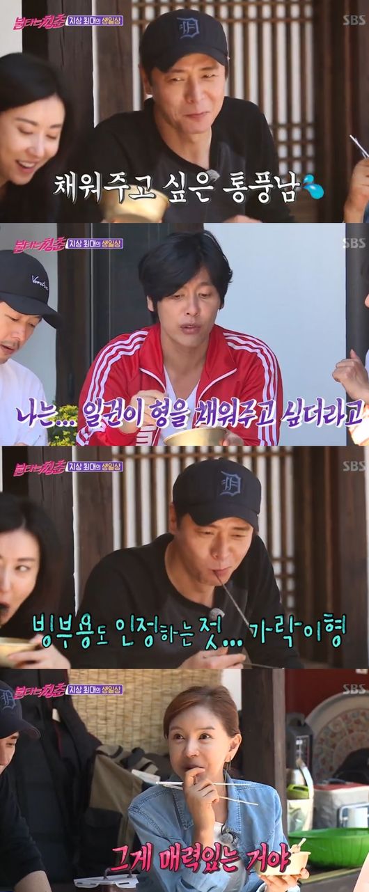 26일 방송된 SBS '불타는 청춘'에서는 공주로 여행을 떠난 청춘들의 모습이 담겼다. 전날 돼지고기를 직접 가져와 삼겹살 파티를 열어줬던 홍일권. 하지만 고장난 색스폰을 수리하며 접착제를 자신의 손에 붙여 허당미를 과시했다.