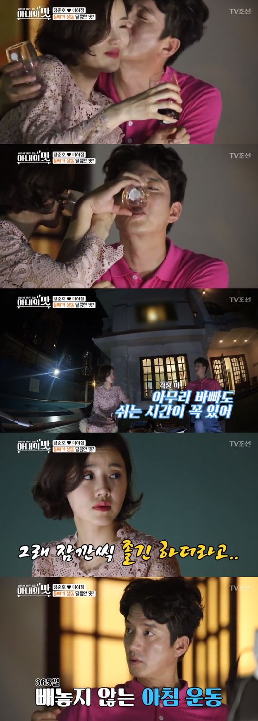 정준호는 와인과 추억의 음식 곰탕면, 김밥을 먹으며 분위기가 무르익자 “러브 샷도 했는데 뽀뽀라도 한번”이라며 그동안 본적 없던 애정표현으로 보여줬다.