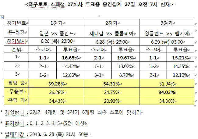 체육진흥투표권 스포츠토토의 수탁사업자인 ㈜케이토토는 28일(목)부터 29일(금)까지 열리는 2018 러시아월드컵 조별예선 3경기를 대상으로 한 축구토토 스페셜 27회차 투표율을 중간 집계한 결과, 참가자의 39.28%가 일본-폴란드(1경기)전에서 일본의 근소한 우세를 전망했다고 27일 밝혔다.