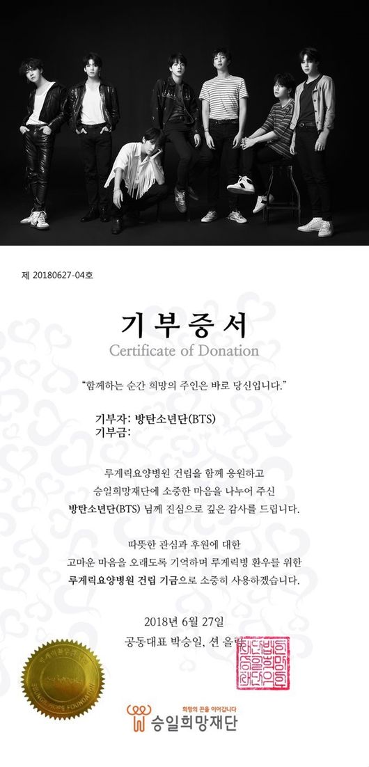 이와 함께 게재된 사진은 승일희망재단에 보낸 기부증서다. 이는 루게릭요양병원 건립 기금으로 쓰인다.