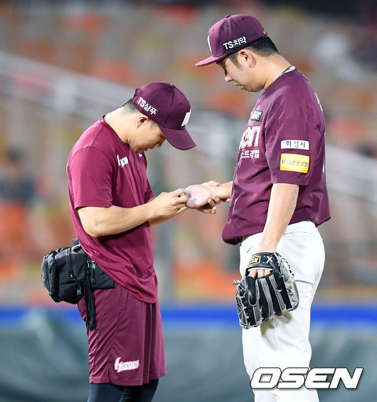 신재영은 전날(26일) 경기 선발 등판해 5이닝 2실점 역투를 펼치며 시즌 4승에 성공했다. 하지만 아쉬움이 남을 수밖에 없는 등판이었다. 최소 퀄리티 스타트까지는 가능할 것처럼 보였지만 6회말 선두타자 전준우에 몸에 맞는 공으로 내보낸 뒤 마운드를 내려왔다. 신재영의 고질적인 문제인 오른손 중지 물집이 재발한 것.
