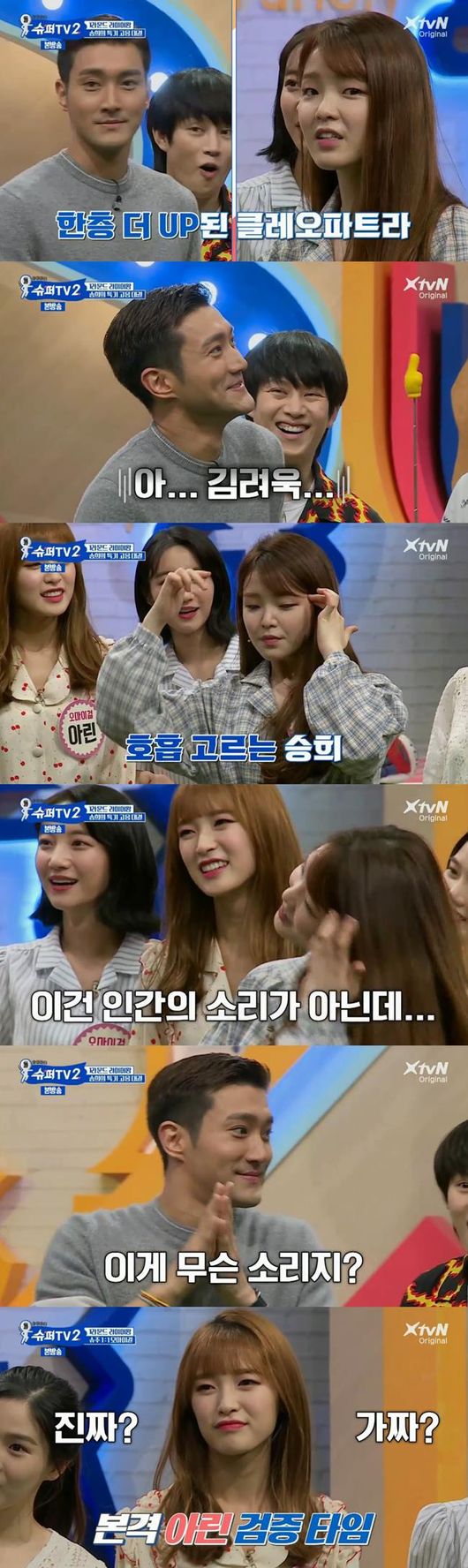 미미에 이어 승희의 고음 대결 검증 시간이 이어졌다. 승희의 고음대결 상대도 최시원이었다. 최시원 슈퍼주니어 내에서 고음 강자로 꼽혔고, 오마이걸 멤버들도 놀란 모습이었다. 하지만 승희가 초고음으로 공격하자 최시원은 당황하며 려욱을 찾기도 했다. 승희는 놀라운 고음으로 슈퍼주니어를 놀라게하며 결국 최시원을 이겼다.