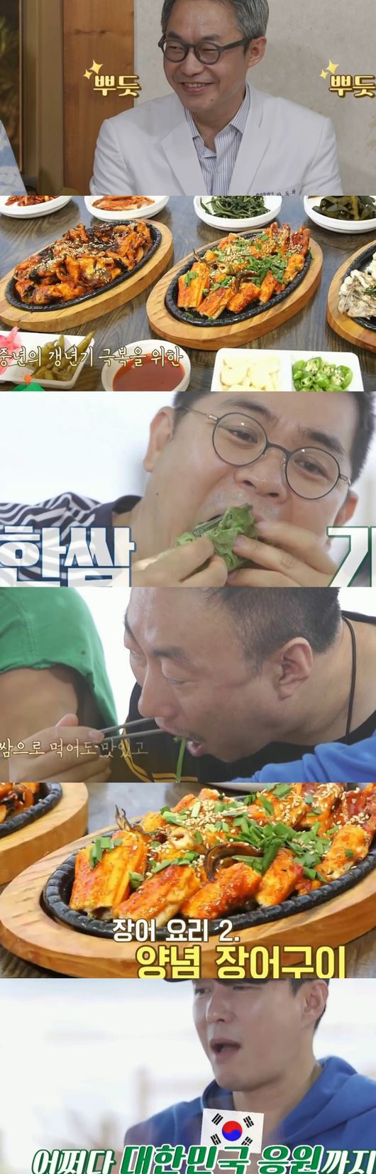 중년 남성의 갱년기 극복을 위한 기력 향상 밥상은 '장어' 였다. 남성갱년기와 스태미너에 효과적이다. 멤버들은 부추와 함께 장어구이를 폭풍 흡입했다. 김용만이 심형탁에게 "너 꼬리 쪽을 먹는 것 같다?"라고 말해 웃음을 자아냈다.