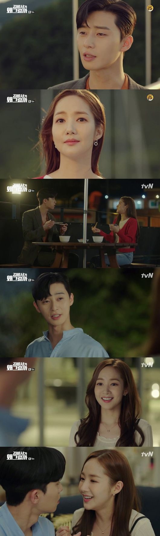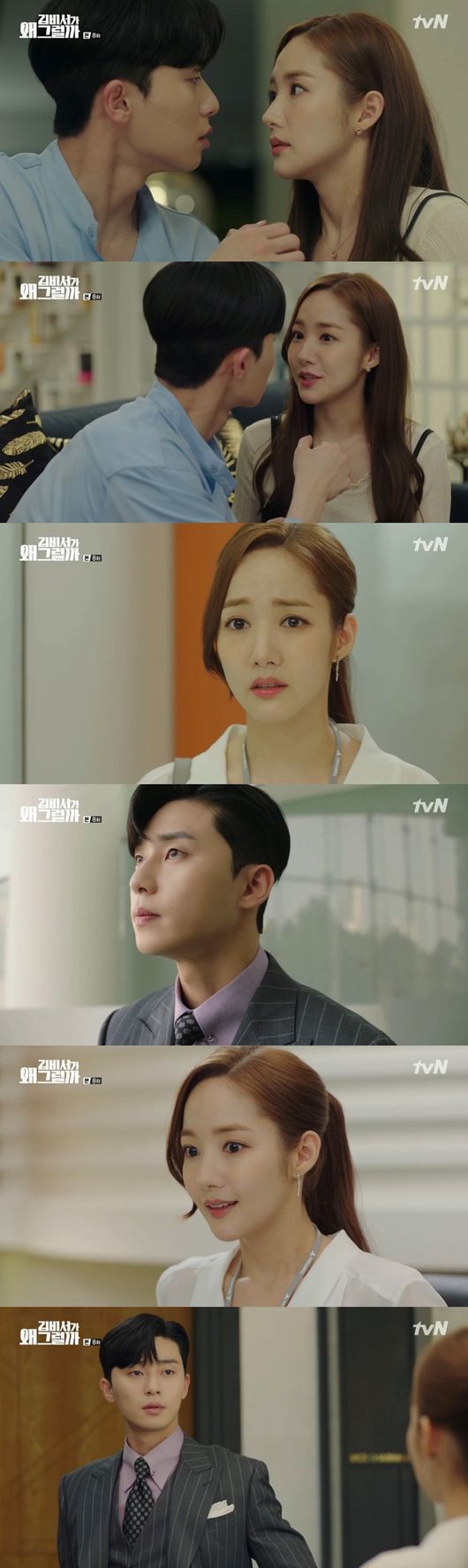 28일 오후 방송된 케이블채널 tvN 수목드라마 '김비서가 왜 그럴까'(극본 백선우 최보림, 연출 박준화) 8회에서는 이영준(박서준 분) 부회장과 김미소(박민영 분) 비서의 본격적인 연애가 그려졌다. 이영준은 비서들의 워크샵까지 따라가서 "김 비서의 모든 걸 감당할 자신이 있다. 김 비서의 자리는 어차피 여기다"라며 적극적으로 고백했던 바.