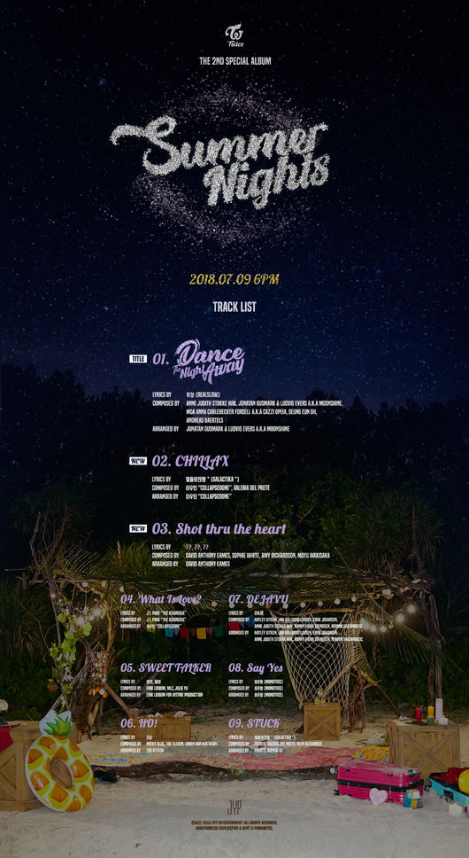 싱그러운 여름 분위기를 풍기는 트와이스의 새 앨범 '서머 나잇(Summer Nights)'에는 지난 4월 9일 발표한 미니 5집 앨범 수록곡에 3곡의 신곡이 추가, 총 9트랙이 수록된다.