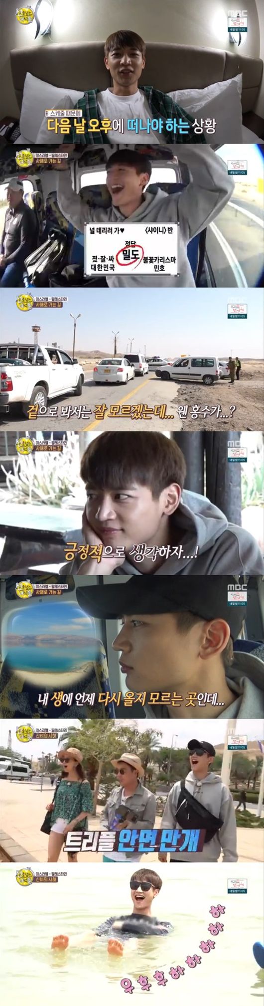 민호는 특히 '선녀들'보다 먼저 한국으로 가야 하는 상황. 출국을 여섯 시간 남긴 채 민호는 초조해했다. 결국 제작진은 길을 돌아 가기로 했고, 모험 끝에 이들은 사해에 도착하게 됐다. 2시간 걸릴 길을 5시간 만에 도착한 이들은 감격스러워했다.