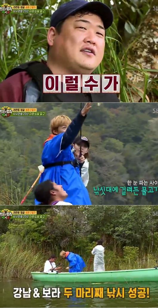남보라는 "허벅지까지 다 빠졌고, 체감은 몸 전체가 구덩이에 빠지는 기분이었다"고 당시 상황을 전했다. 집을 짓던 김병만은 부족원들이 소득이 시원찮자, 강남과 함께 물 속으로 들어갔다. 고전하던 두 사람은 물고기들의 아지트를 발견했고, 집중 공략해 게 1마리, 물고기 7마리는 낚는 소득을 올렸다.