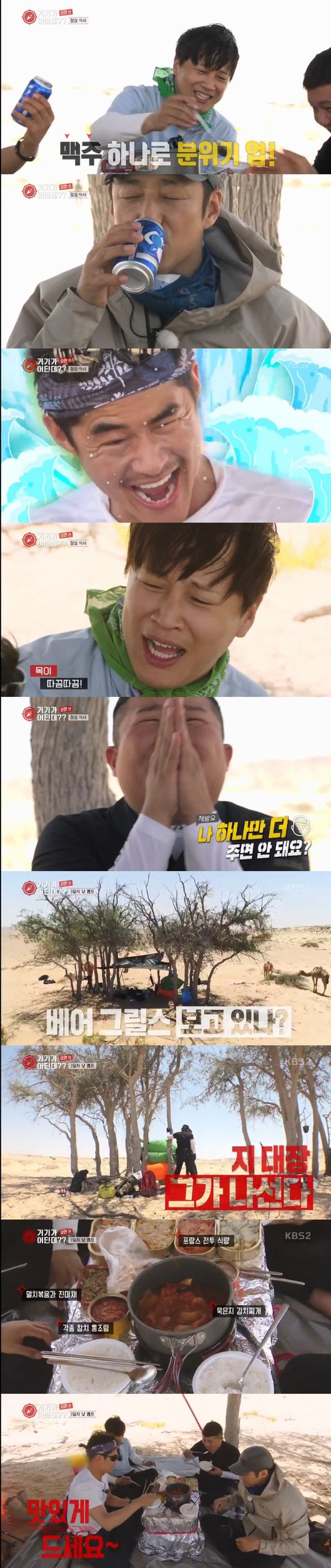 멤버들은 시원한 맥주를 맛보고 입을 다물지 못했다. 낙타가 직접 아이스박스에 실어온 것. 맥주 한모금씩 마신 멤버들은 CF못지 않은 표정을 지으며 신나했다.
